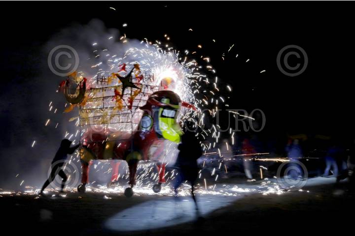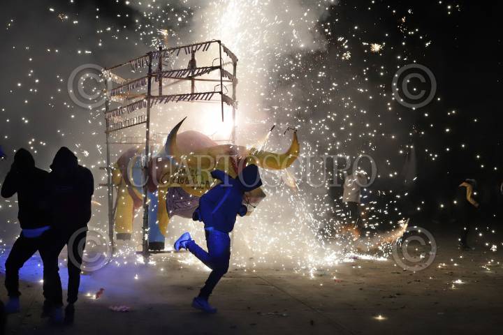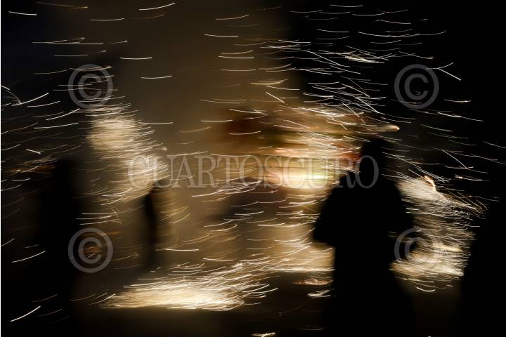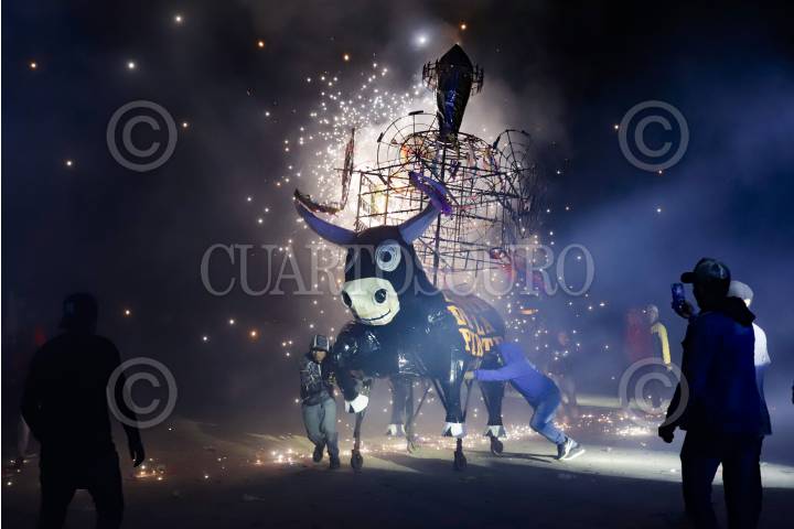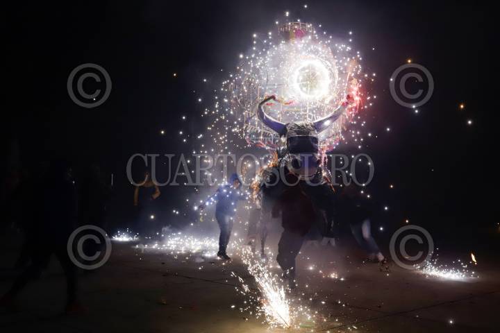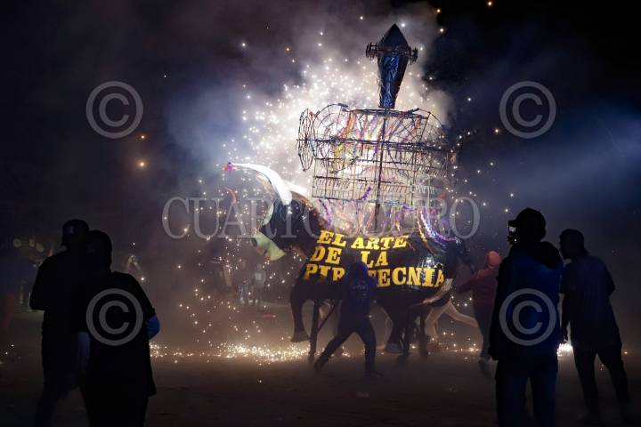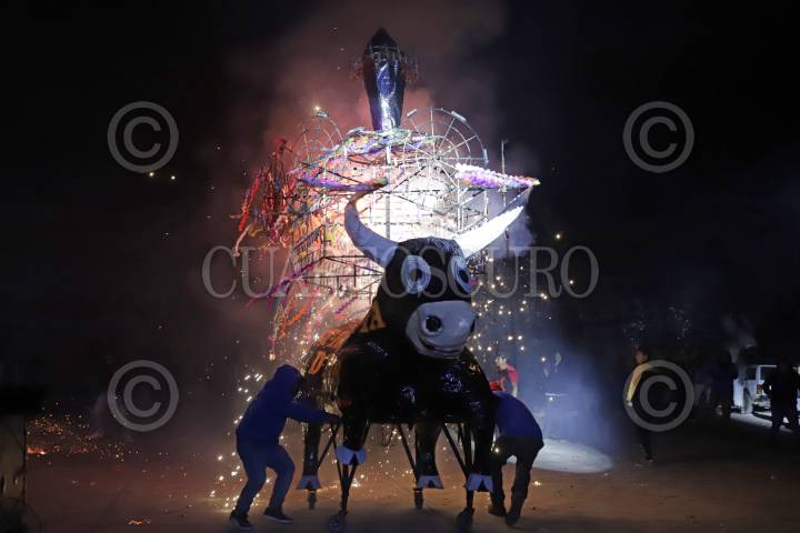Coheteros de la junta auxiliar de San Cristóbal Tepontla festejan el Día de San Antonio Abad con toritos de pirotecnia.