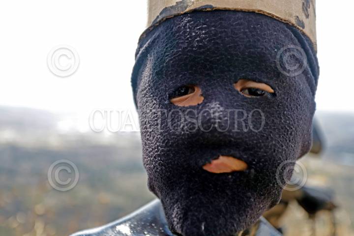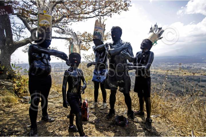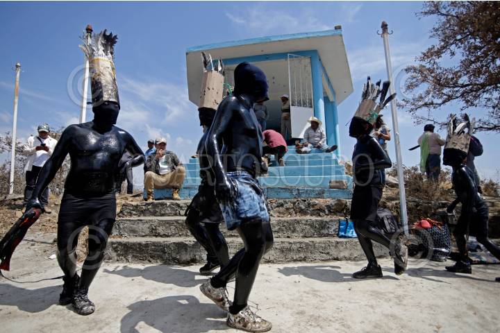 Untados con brea en cara y cuerpo, un grupo de Xinacates o "pintados" participan en la Danza del Buen Temporal para atraer la lluvia y buenas cosechas, en el cerro Teotón ubicado en la junta auxiliar de San Pedro Yancuitlalpan.