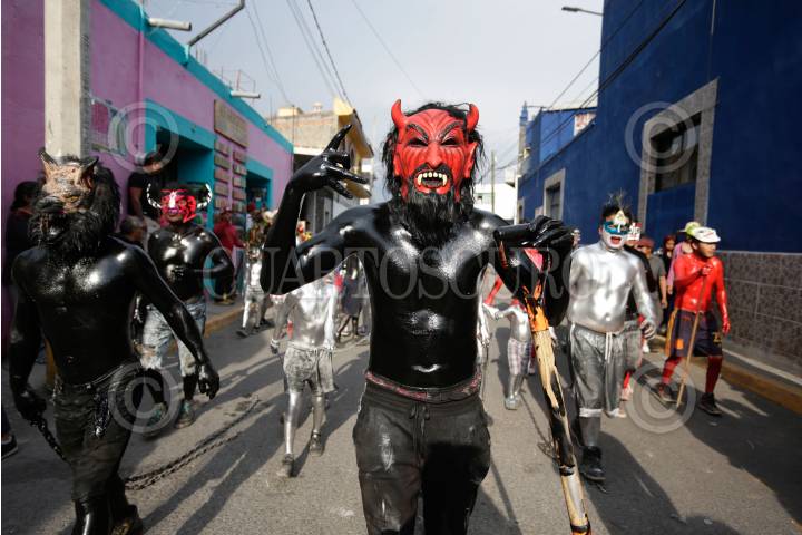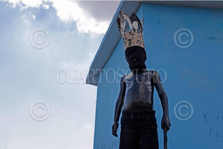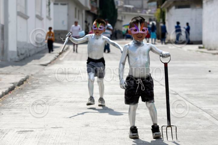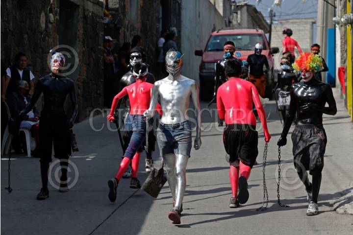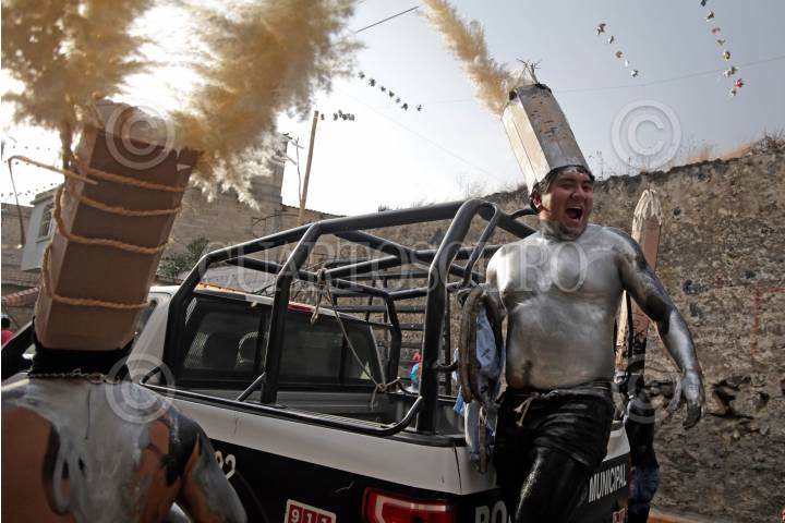 Los pintados o xinacates desfilaron cubiertos de pintura vegetal, dorada, negra o plateada mezclada con aceite, para participar en el carnaval de San Nicolás de los Ranchos.