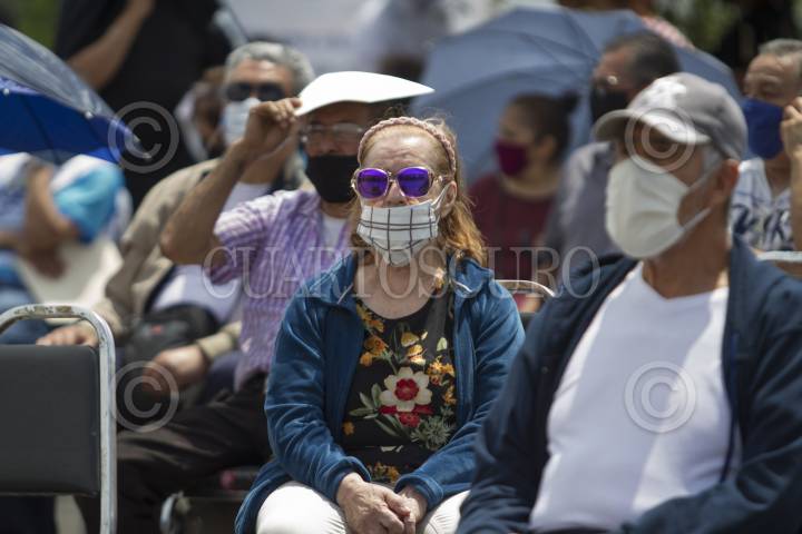 Ante las altas temperaturas, adultos mayores cubren su cabeza del sol durante la espera a ser vacunados contra el Covid-19, en el municipio de San Nicolás.