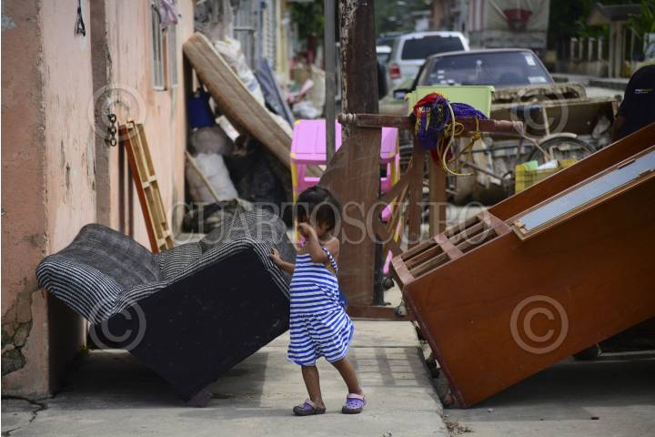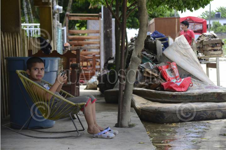 SAN RAFAEL, VERACRUZ., 28AGOSTO2013.- Habitantes del municipio de San Rafael que no necesitaron acudir al albergue ubicado en el palacio municipal, realizan labores de limpieza en sus hogares tratando de recuperar algunas de sus pertenencias tras el paso de la tormenta tropical Fernand. Así mismo rellenaron con tierra y piedras un deslave del puente San Rafael que se deslavó dejando incomunicada la zona. FOTO: RUBÉN ESPINOSA / CUARTOSCURO.COM