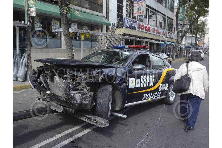 MÉXICO, D.F., 26AGOSTO2015.- Un choque entre una patrulla de la SSPDF y un auto Bora, con placas HFB-14-15 del estado de Guerrero, ocasionó que este último vehículo le pegara a dos autos más; una camioneta Avanza placas WVS-279 y un Chevy placas 631-WFK. Los hechos ocurrieron en la avenida San Cosme esquina con Serapio Rendón, colonia Sab Rafael. Testigos señalaron que la patrulla provocó el accidente al pasarse el alto. FOTO: ARMANDO MONROY /CUARTOSCURO.COM