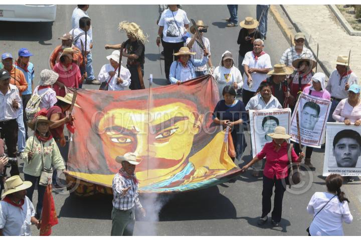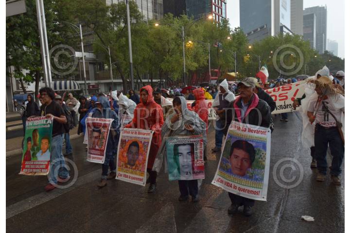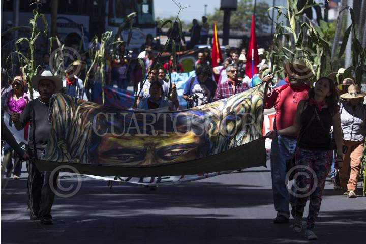 CIUDAD DE MÉXICO, 04MAYO2017.- Integrantes de Pueblos en Defensa de la Tierra-Atenco (FPDTA) y una comitiva de los padres de los normalistas de Ayotzinapa marcharon del Ángel a la Independencia rumbo al Zócalo, aunque la policiía capitalina les ìmpidió el paso en avenida Juárez. La movilización a once años del "Mayo Rojo" que conmemora el desalojo violento que se vivió en el Pueblo de San Salvador Atenco por la Policía Federal y la Policía Estatal, tras el conflicto por la construcción de un proyecto aeroportuario. FOTO: ARMANDO MONROY /CUARTOSCURO.COM
