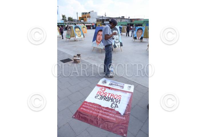 SAN SALVADOR ATENCO, ESTADO DE MÉXICO, 17NOVIEMBRE2014.- Montan en la explanada de San Salvador Atenco la obra, 43 rostros, 43 Nombres realizado por artistas guerrerenses donde plasman en pinturas los rostros de los normalistas de Ayotzinapa desaparecidos en el municipio de Iguala. FOTO: SAÚL LÓPEZ /CUARTOSCURO.COM