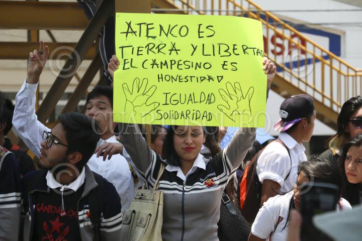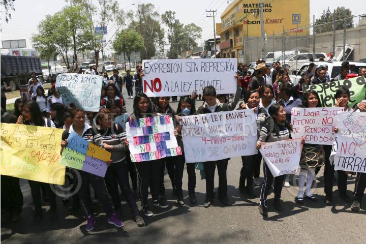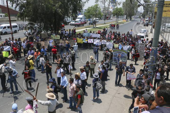CHICOLOAPAN, ESTADO DE MÉXICO, 04MAYO2016.- Integrantes del Frente de Pueblos en Defensa de la Tierra y organizaciones en defensa de la tierra, agua y bosques del Estado de México, marcharon de San Salvador Atenco hacia el Ángel de la Independencia, en el municipio de San Vicente Chicoloapan un grupo de estudiantes recibieron a la caravana y realizaron un mitin sobre la carretera federal Texcoco-Los Reyes. FOTO: SAÚL LÓPEZ /CUARTOSCURO.COM