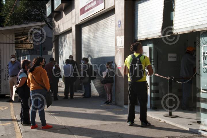 Una docena de personas esperan atención a las afueras del Mercado de Comida de Coyoacán.