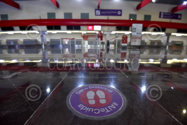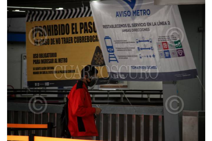 Un hombre camina hacía los torniquetes para el acceso al metro en la estación Cuatro Caminos de la línea 2. A su al rededor la estación cuenta con múltiples invitaciones a respetar el uso de cubrebocas y sana distancia