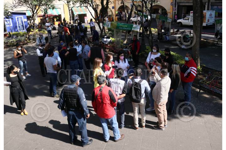 Reporteros, camarógrafos y fotógrafos realizan su labor en el zócalo de Cuernavaca sin medidas de sana distancia en semáforo rojo por Covid-19.