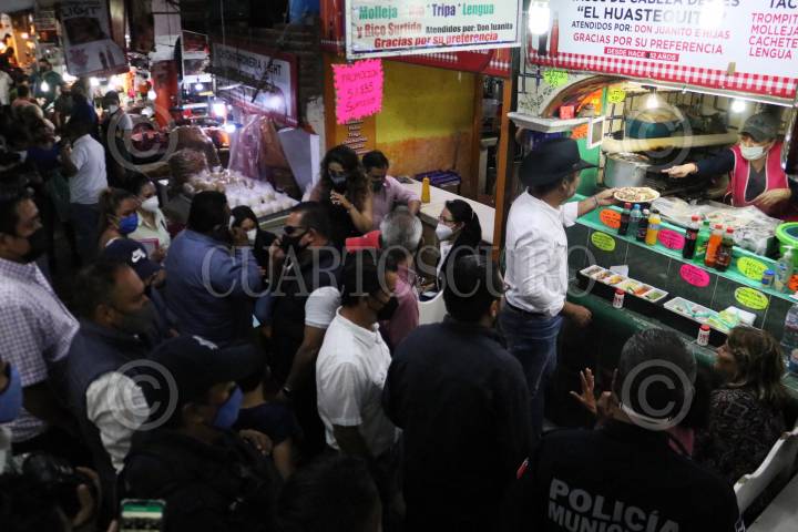 El alcalde de la capital sin respetar la distancia social para evitar contagios de Covid-19, recorre el mercado Adolfo López Mateos, la comitiva que le acompaña provoca gentíos.