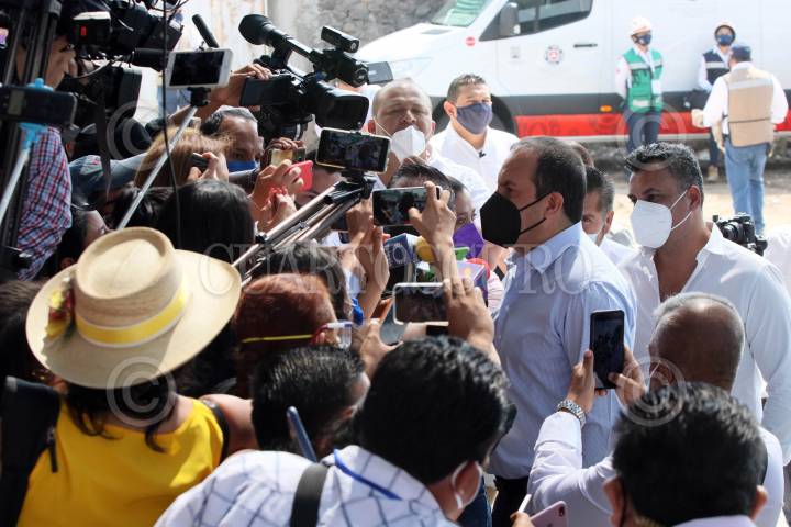 Cuauhtémoc Blanco Bravo, gobernador de Morelos, atiende a los reporteros y camarógrafos, los cuales se amontonan para obtener una declaración sin respetar la sana distancia para evitar contagios de Covid-19.
