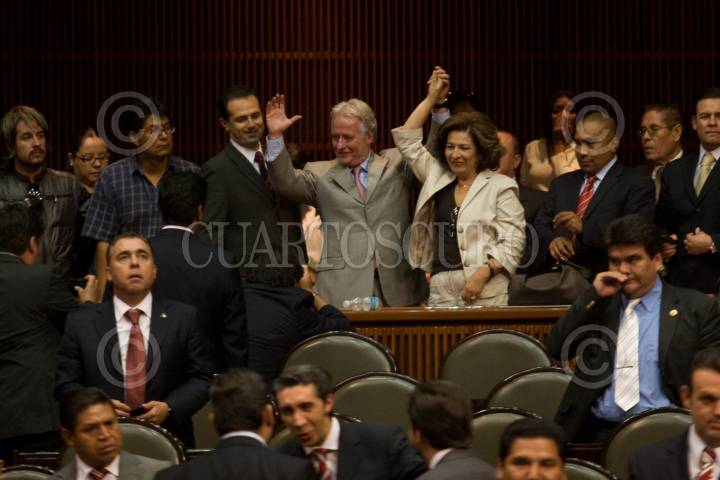 MÉXCO D.F., 07OCTUBRE2010.- Isabel Miranda de Wallace, Presidenta de presidenta de la Asociación Alto al Secuestro y Alejandro Martí García, presidente de México SOS, celebran la aprobación, de Ley General para Prevenir y Sancionar los Delitos en Materia de Secuestro, que fue aprobada durante la sesión en la Cámara de Diputados. FOTO: GUILLERMO PEREA/CUARTOSCURO.COM