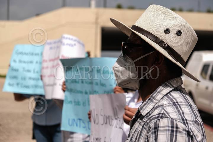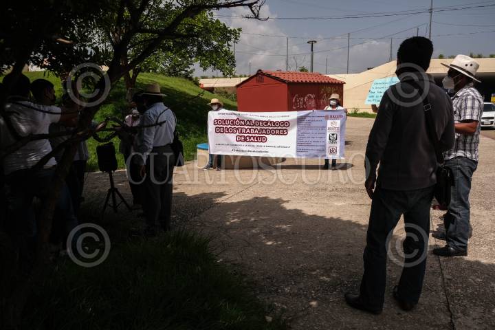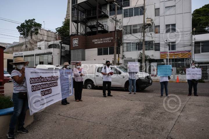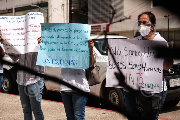 Trabajadores del sector salud sostienen mantas durante una protesta.