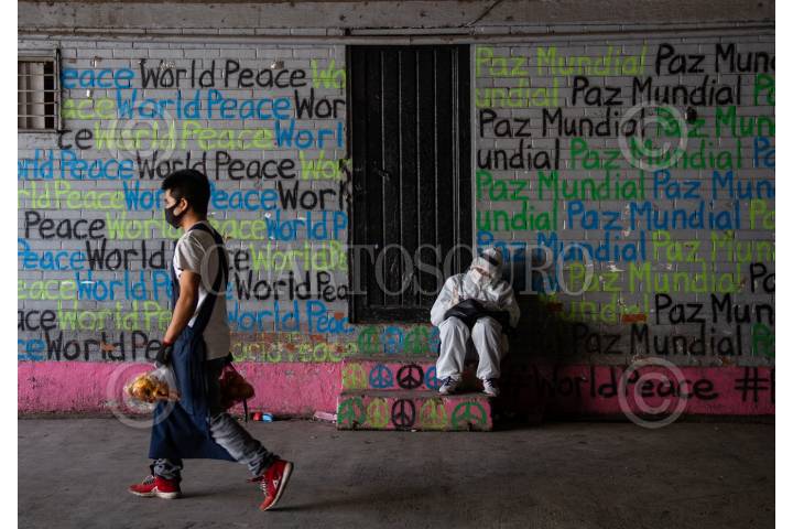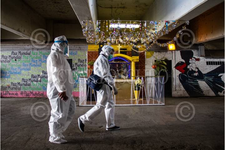 Dos encuestadores de sintomas COVID-19 camina por los pasillos de la Central de Abastos