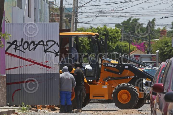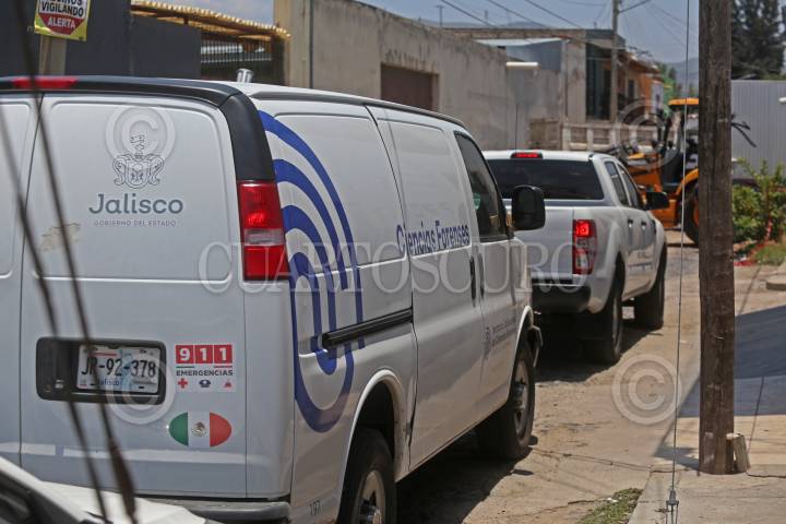 En primer plano y a unos metros de una fosa clandestina localizada en el poblado de Santa Anita, se observa una camioneta del Instituto Jalisciense de Ciencias Forenses (IJCF) y al fondo una retroexcavadora que trabaja en el lugar de los hechos.