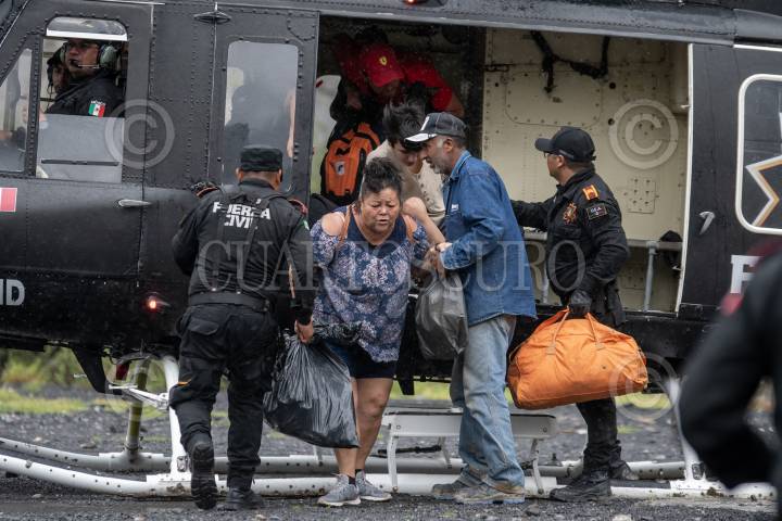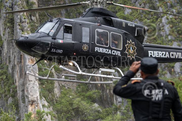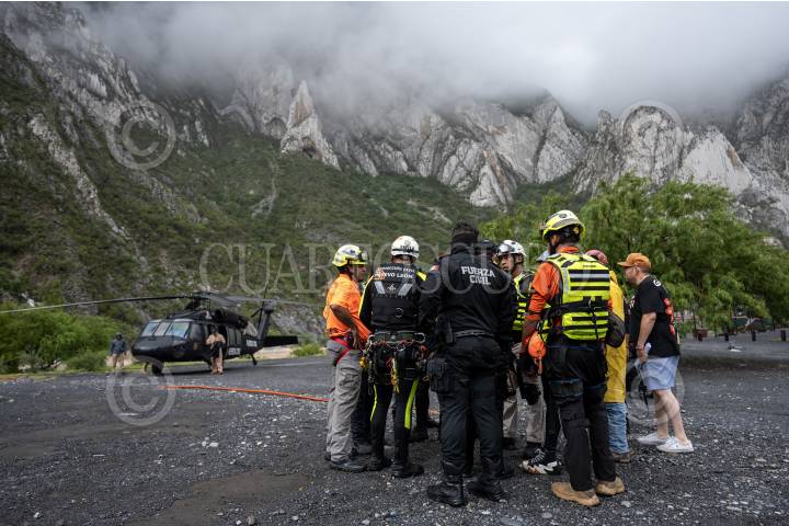SANTA CATARINA, NUEVO LEÓN, 21JUNIO2024.- Elementos de Protección Civil del Estado de Nuevo León, realizan labores de rescate aéreo a personas donde sus viviendas resultaron inundadas en comunidades aledañas al Parque La Huasteca. FOTO: ESPECIAL / CUARTOSCURO.COM
