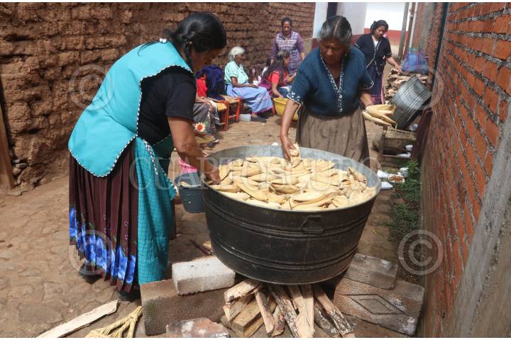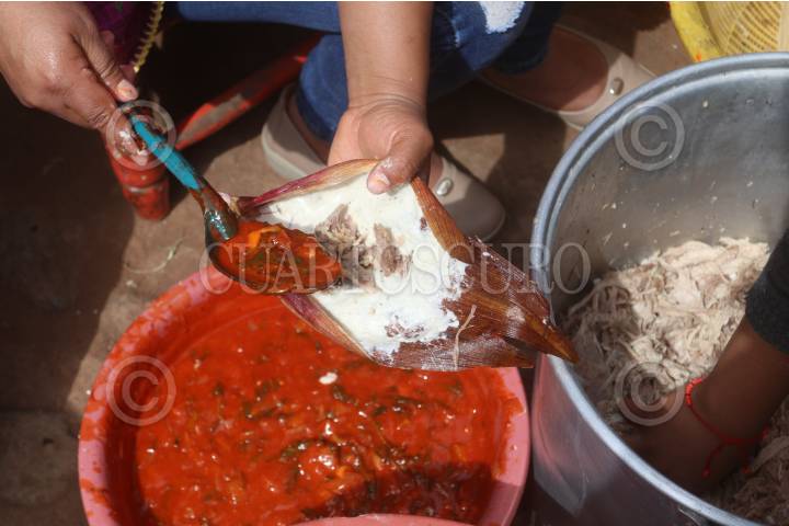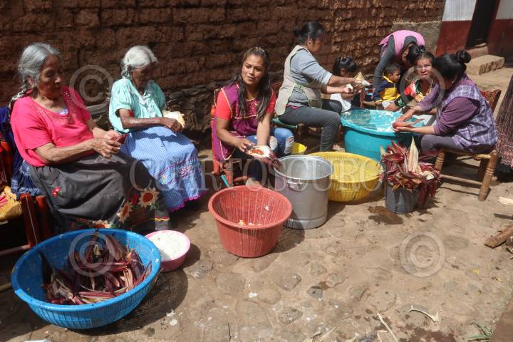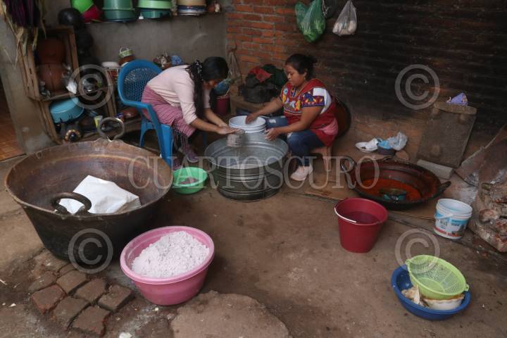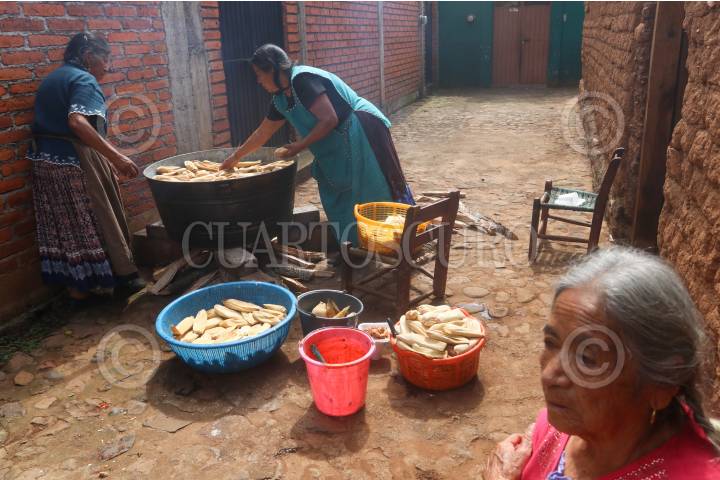 Mujeres purépechas elaboraron tamales de carne y atole de pinole para ofrecer ofrenda a los vecinos y visitantes que acudan al altar de su familiar en la casa donde falleció
