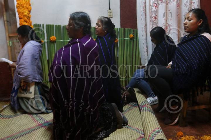 Mujeres purépechas rezan frente a un altar en la espera de su llegada en Santa Fe de la Laguna, Michoacán