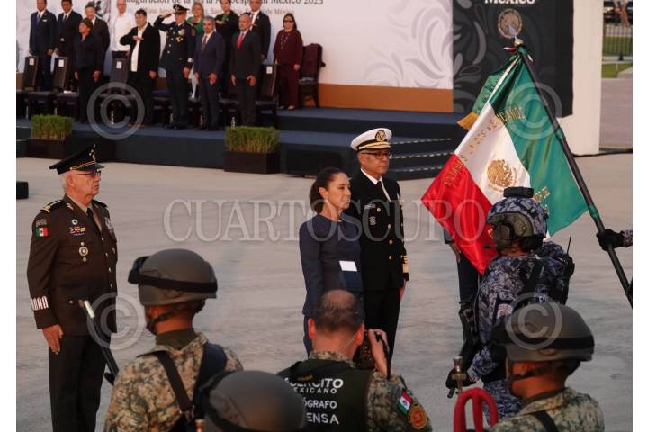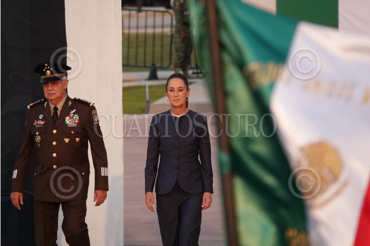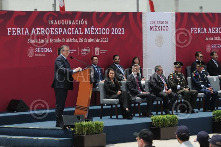 ZUMPANGO, ESTADO DE MÉXICO, 22ABRILO2025.- Ricardo Trevilla, secretario de la Defensa Nacional, y Claudia Sheinbaum, presidenta de México, encabezó la inauguración de la Feria Aeroespacial Mexicana (FAMEX) 2025 en las inmediaciones de la Base Aérea de Santa Lucía. FOTO: GALO CAÑAS/CUARTOSCURO.COM