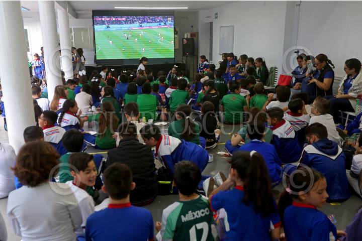 Alumnos y docentes del Colegio Santa Mónica, durante la transmisión del juego de la selección de México contra su similar de Polonia en su debut en la Copa Mundial Qatar 2022.