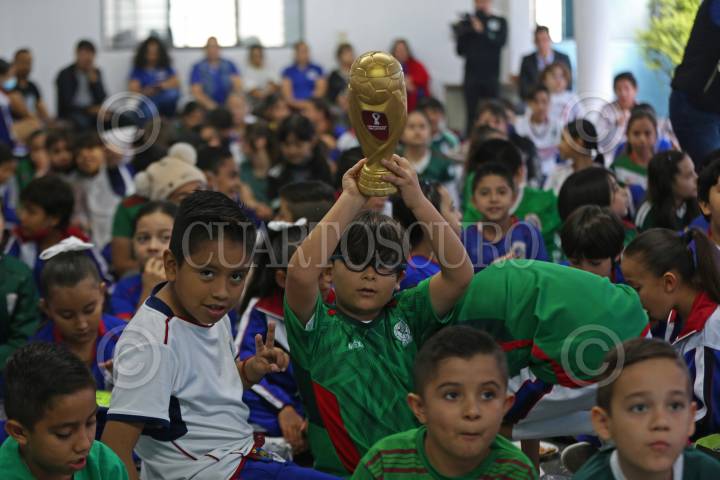 Alumno del Colegio Santa Mónica, levanta una copa de juguete mientras veian el juego de la selección de México contra su similar de Polonia en su debut en la Copa Mundial Qatar 2022.
