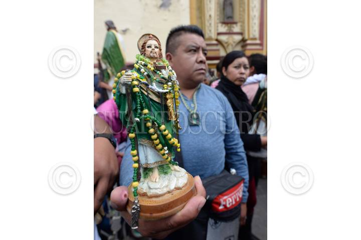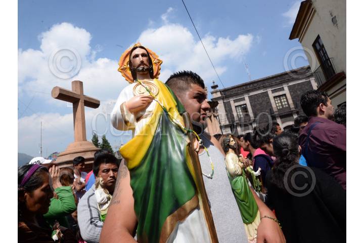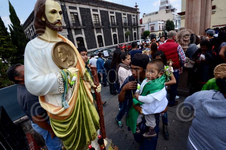TOLUCA, ESTADO DE MÉXICO, 28OCTUBRE2017.- Como cada 28 de octubre seguidores de San Judas Tadeo acudieron a distintas iglesias para llevar sus imágenes del santo a escuchar misa y ser bendecidos, tal es el caso de la iglesia de la Santa Veracruz, en donde se dieron cita fieles católicos para celebrarlo. FOTO: ARTEMIO GUERRA BAZ /CUARTOSCURO.COM