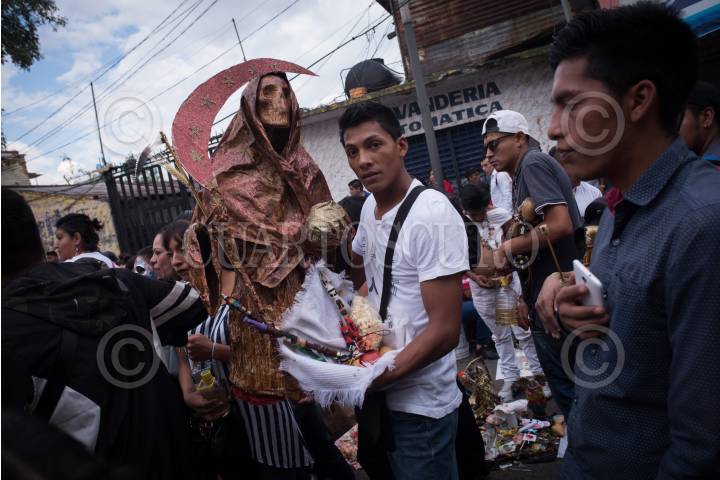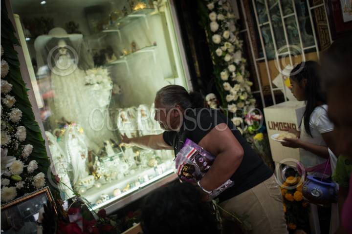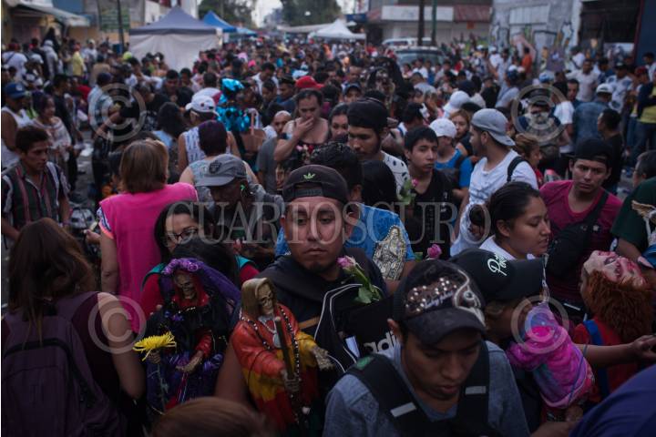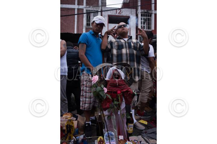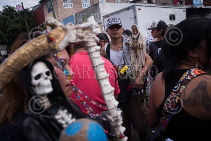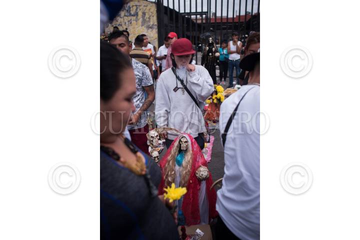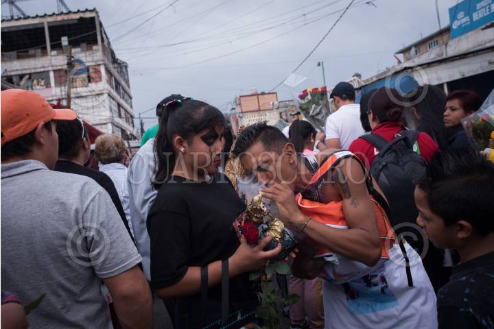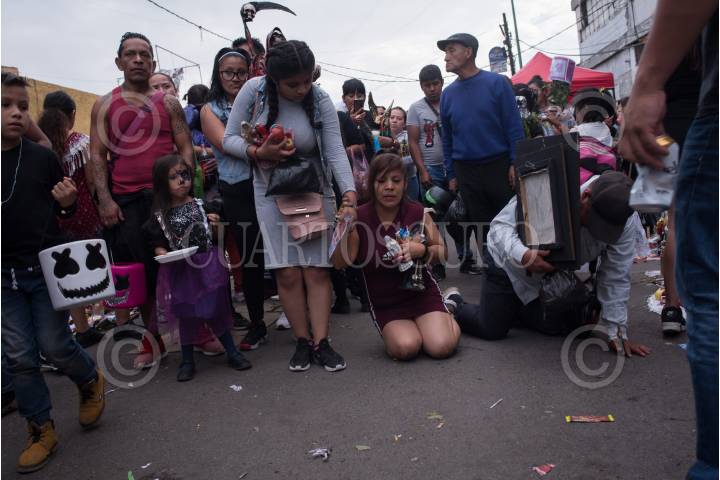 CIUDAD DE MÉXICO, 01NOVIEMBRE2019.- Como cada primero de Noviembre, miles de devotos a la Santa Muerte se dieron cita en la colonia Morelos para visitar el altar dedicado a "La Niña Blanca". Incienso, copal, marihuana, licores, cigarros cubanos, mexicanos y chinos, aromatizan la tarde en la calle de Panaderos, algunos vienen de rodillas pagando mandas, otros portando colguijes y ofrendas entonan cantos a la "flaquita". El culto a la Santa Muerte tiene sus orígenes, según algunos enfoques históricos, en tiempos prehispánicos, siendo un híbrido con el culto a la deidad mexica de la muerte, Mictlantecuhtli. FOTO: PEDRO ANZA /CUARTOSCURO.COM