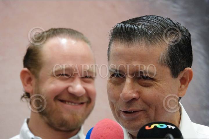 CIUDAD DE MÉXICO, 27MAYO2024.- Giovani Gutiérrez, candidato a la alcaldía de Coyoacán, y Santiago Taboada, candidato a Jefe de Gobierno, durante una conferencia de prensa realizada en el Holiday Inn-Mexico Plaza Universidad. FOTO: GRACIELA LÓPEZ /CUARTOSCURO.COM