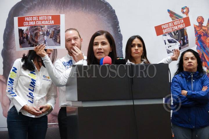 CIUDAD DE MÉXICO, 27MAYO2024.- Karen Quiroga, candidata a la alcaldía Iztapalapa, acompañada de Lía Limón, candidata a la alcaldía de Álvaro Obregón; Santiago Taboada, candidato a Jefe de Gobierno, y Alessandra de la Vega, candidata a la alcaldía Cuauhtémoc, durante su participación en una conferencia de prensa realizada en el Holiday Inn-Mexico Plaza Universidad. FOTO: GRACIELA LÓPEZ /CUARTOSCURO.COM