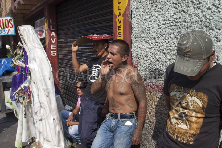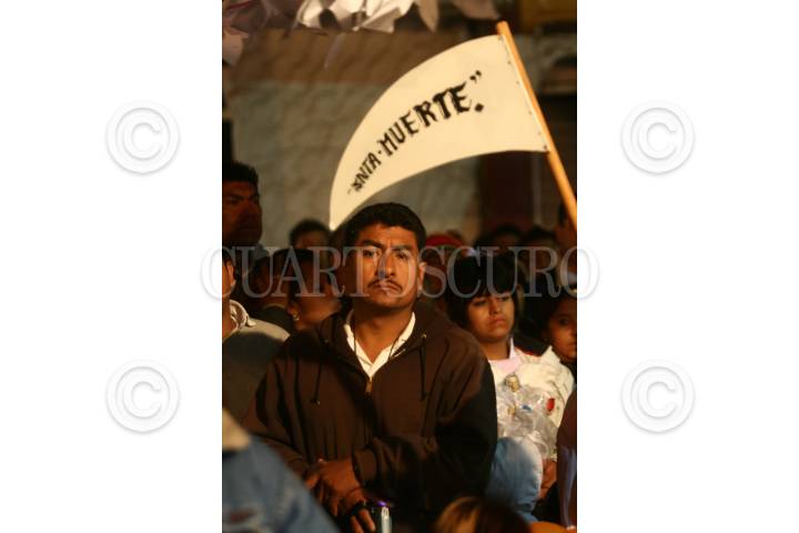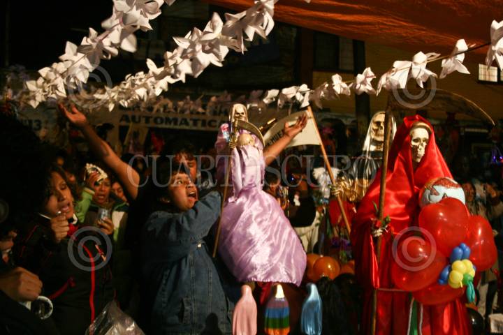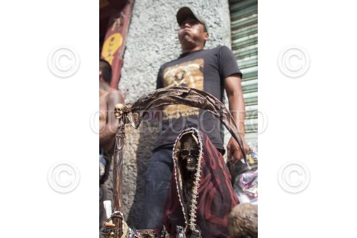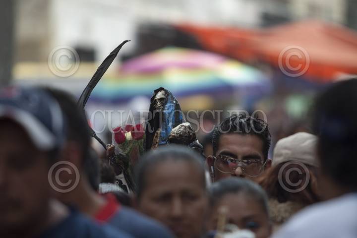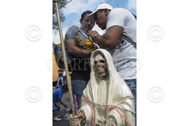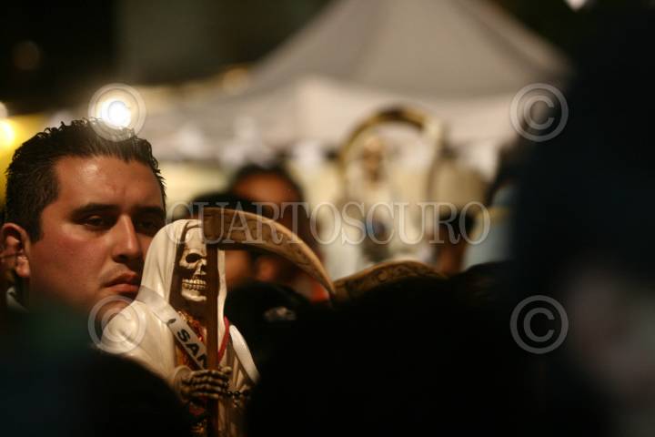 MÉXICO, D.F., 01NOVIEMBRE2008.- Miles de personas acuden hoy, Día de Todos los Santos, al populoso barrio de Tepito, en el centro de Ciudad de México, a celebrar el septimo aniversario del altar que la controvertida imagen de la Santa Muerte tiene en sus calles,para muchos, la Santa Muerte es la auténtica patrona del barrio y cada primero de mes los fieles van a rezarle un Rosario, aunque hoy, por coincidir con el aniversario, es aún más multitudinario. La niña blanca está rodeada por pequeñas “catrinas”, vestidas de mujer que representan a la muerte, y sus fieles, y en lugar de purificarse con incienso como en los tradicionales lugares de culto cristiano recurren al humo de la marihuana. FOTO: SÁSHENKA GUTIERREZ/CUARTOSCURO.COM