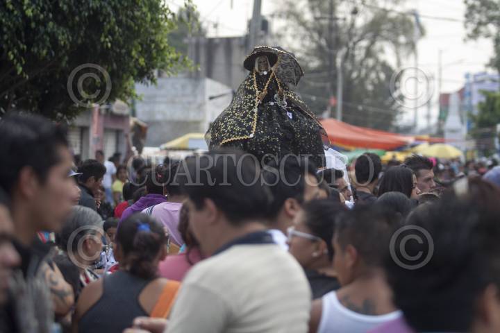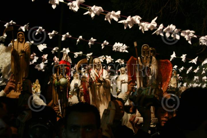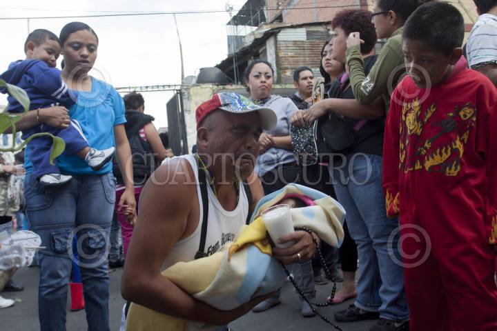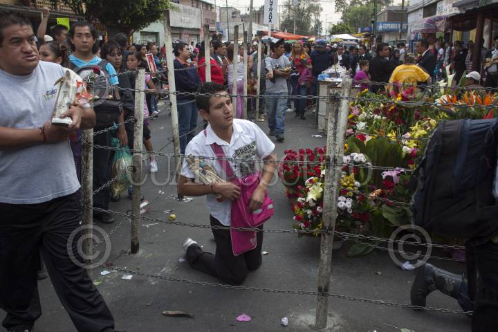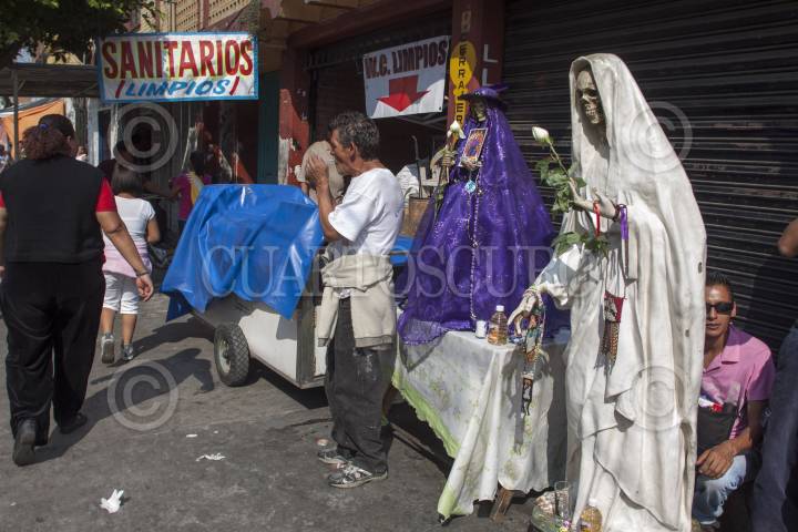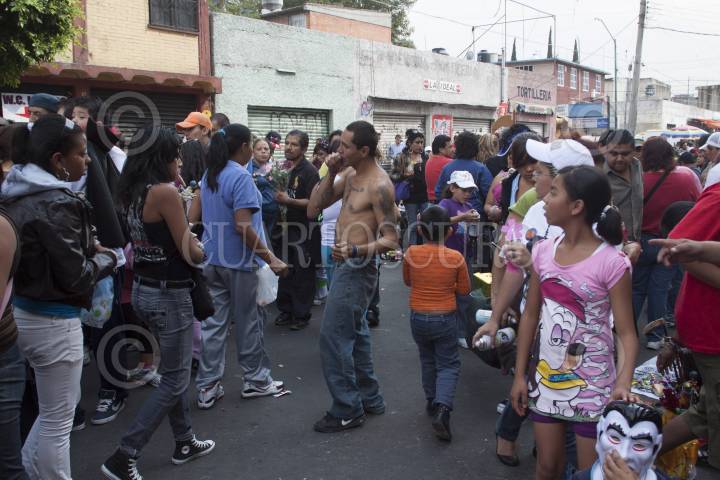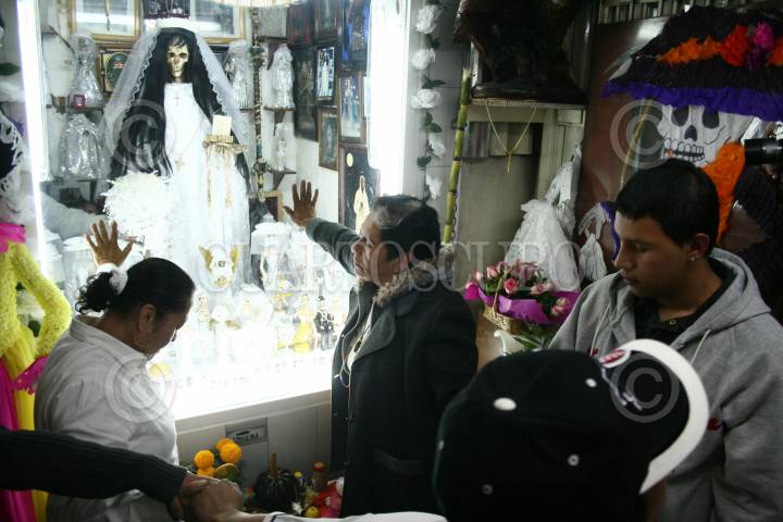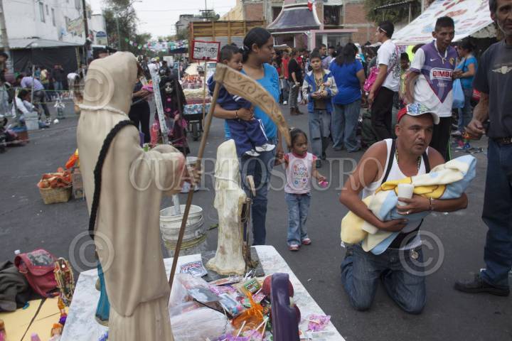 Tepito Celebracion Blanquita-7.jpg MÉXICO, D.F., 01NOVIEMBRE2012.- Como cada año decenas de vecinos se congregan en el altar de la "Santa Muerte" que se ubica en el barrio de Tepito para celebrar el aniversario de "blanquita" como la llaman muchos fieles, las efigies son vestidas de gala con preciosos vestidos y la persona que las lleva regalan dulces o recuerdos. Muchas personas cumplen sus mandas de rodillas abriéndose paso entre la gente para llegar el altar en donde le dan gracias a la "santísima" por los favores recibidos. En las calles aledañas muchos colocan a sus altares en donde al paso de la gente les ofrece una ahumada de mariguana o cigarro, además de que les roncean alcohol en su honor. FOTO: MOISÉS PABLO /CUARTOSCURO.COM