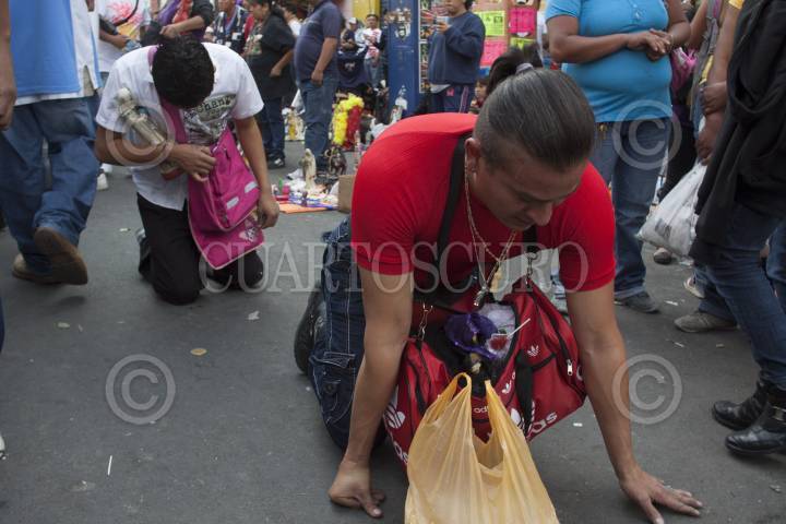 MÉXICO, D.F., 01NOVIEMBRE2012.- Como cada año decenas de vecinos se congregan en el altar de la "Santa Muerte" que se ubica en el barrio de Tepito para celebrar el aniversario de "blanquita" como la llaman muchos fieles, las efigies son vestidas de gala con preciosos vestidos y la persona que las lleva regalan dulces o recuerdos. Muchas personas cumplen sus mandas de rodillas abriéndose paso entre la gente para llegar el altar en donde le dan gracias a la "santísima" por los favores recibidos. En las calles aledañas muchos colocan a sus altares en donde al paso de la gente les ofrece una ahumada de mariguana o cigarro, además de que les roncean alcohol en su honor. FOTO: MOISÉS PABLO /CUARTOSCURO.COM