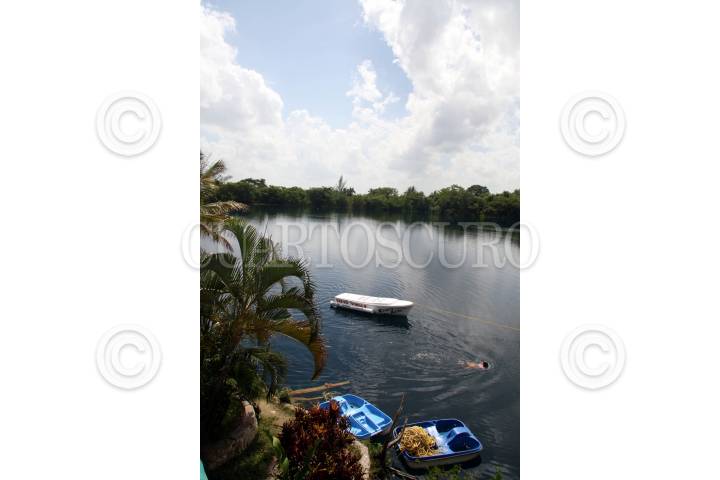 OTTO POMPEYO BLANCO, QUINTANA ROO, 07AGOSTO2007.- El Cenote Azul ubicado a 53 kilometros de la capital, en la cuminidad de Bacalar es uno de los santuarios más importantes del estado y el unico en el que sus cristalinas aguas dulces son color azul. Los lugareños cuentan que dentro de sus aguas que no tienen profundidad exacta se esconden grandes misterios ya que se relizaban ritos con doncellas virgenes a los dioses Mayas. FOTO: MARCO POLO GUZMÁN HERNÁNDEZ/CUARTOSCURO.COM