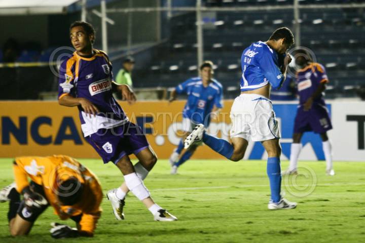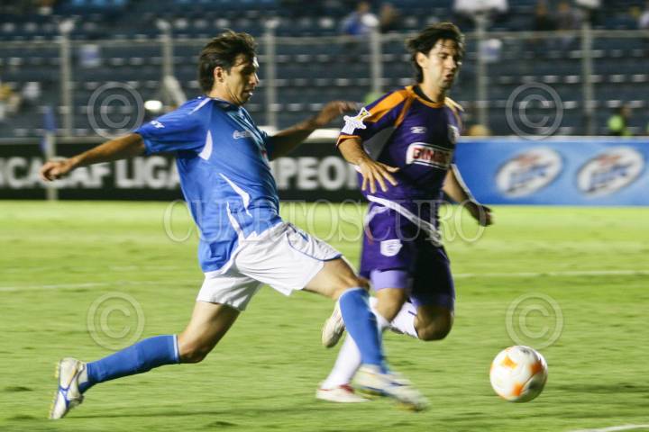 MÉXICO, D.F., 23SEPTIEMBRE2008.- Marcelo Adrián Carrusca intenta tirar a gol ante el asedió de la defensa Saprissa, en el partido que la Máquina de Cruz Azul venció 4-0 al Saprissa de Costa Rica, dentro de la liga de Campeones de la Concacaf, el cual fue disputado en el estadio Azul. FOTO: ISAAC ESQUIVEL/CUARTOSCURO.COM