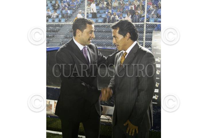 MÉXICO, D.F., 23SEPTIEMBRE2008.- Los técnicos de Saprissa, Jeaustin Campos, y Cruz Azul, Benjamin Galindo, se saludan previo al partido en que la Máquina de Cruz Azul venció 4-0 al Saprissa de Costa Rica, dentro de la liga de Campeones de la Concacaf, el cual fue disputado en el estadio Azul. FOTO: ISAAC ESQUIVEL/CUARTOSCURO.COM