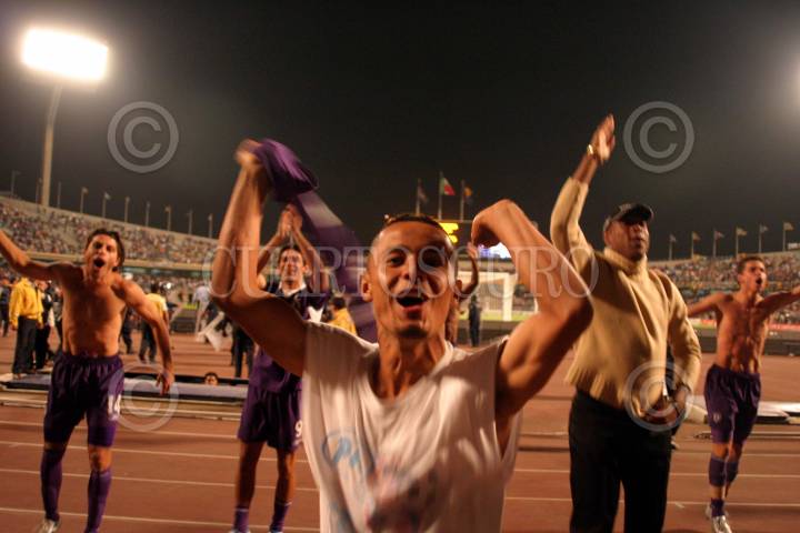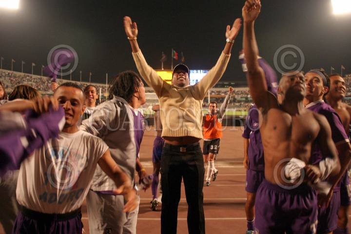 MEXICO, D.F., 11MAYO2005.- Hernan Menford, entrenador del equipo costarricense Saprissa festeja con su equipo la obtención del campeonato de la Concacaf, ante los Pumas de la UNAM de México, en el estadio C.U. FOTO: Moisés Pablo/CUARTOSCURO.COM