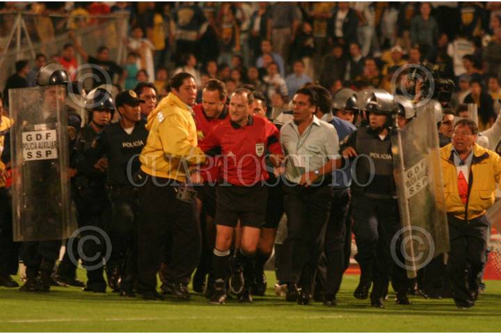 MEXICO, D.F., 11MAYO2005.- Granaderos protejen al árbitro en el partido de Pumas contra Saprissa. FOTO: Moisés Pablo/CUARTOSCURO.COM