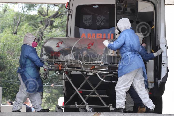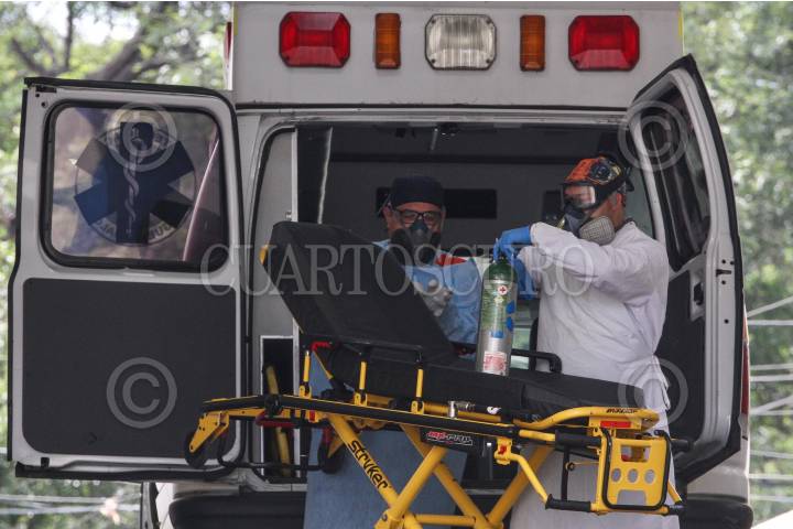 Paramédicos ingresan a una persona encapsulada al área de urgencias por COVID-19.