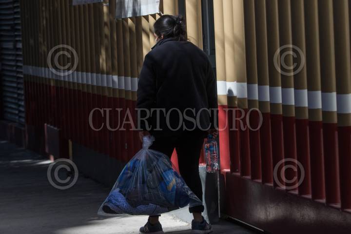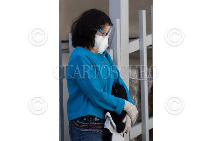 Una mujer que carga la ropa un paciente espera noticias de su familiar quien fue ingresado momentos antes al Área de Covid-19 en el Hospital General de México.