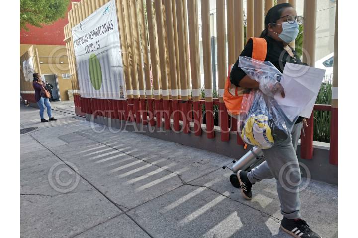 Un mujer camina con el tanque de oxígeno y la ropa de su familiar quien fue ingresado momentos antes al área Covid-19 del Hospital General.