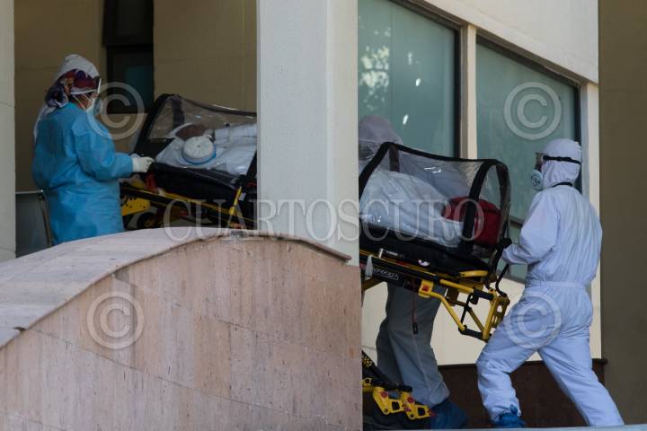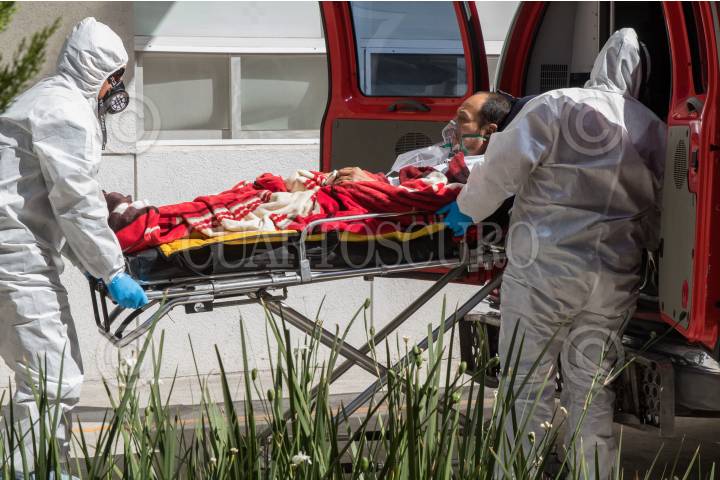 Paramédicos ingresan a un paciente con síntomas de Covid-19 al Triage Respiratorio del Centro Médico Siglo XXI.