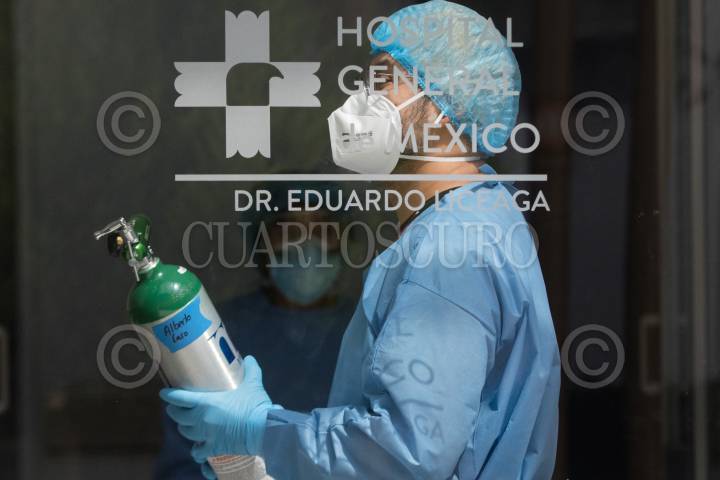 Personal médico con un tanque de oxígeno medicinal en el área de Covid-19 del Hospital General de México Dr. Eduardo Liceaga.