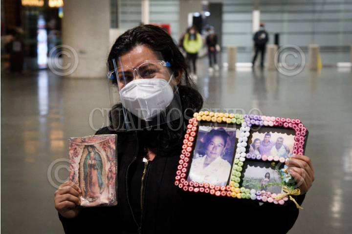 Carla, médico de Oaxaca carga una imagen de la Virgen de Guadalupe y una cuadro con fotografías de su familia durante su llegada a la Terminal 2 del Aeropuerto internacional de la Ciudad de México (AICM), para integrarse al equipo de atención en los hospitales de pacientes con covid-19.