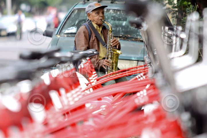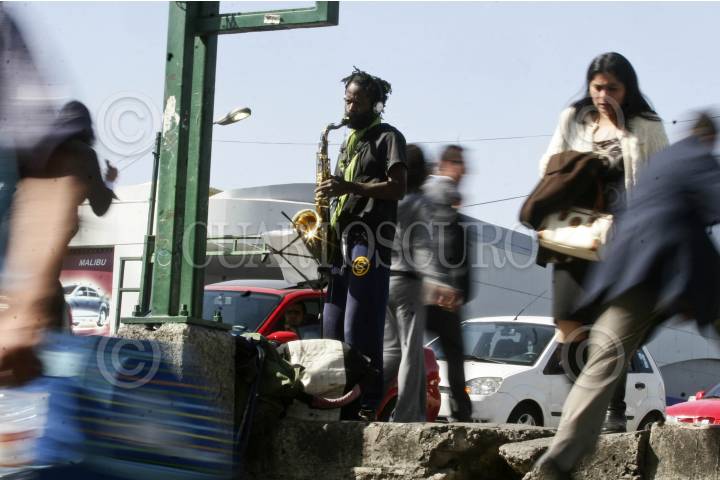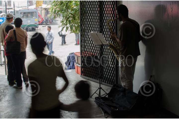 MÉXICO, D.F., 27FEBRERO2009.- Un saxofonista se gana unas monedas tocando algo de jazz en la esquina de Cauhtemoc y Viaducto, ante el pasar desinteresado de las personas. FOTO: ISAAC ESQUIVEL/CUARTOSCURO.COM
