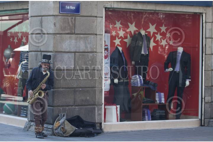 MÉXICO, D.F., 30NOVIEMBRE2011.- Debido al incremento del desempleo en el país, un hombre de la tercera edad se ve en la necesidad de ganarse unas monedas tocando su saxofón sobre las calles del Centro Histórico. FOTO: RODOLFO ANGULO/CUARTOSCURO.COM