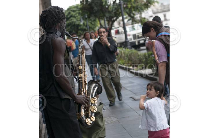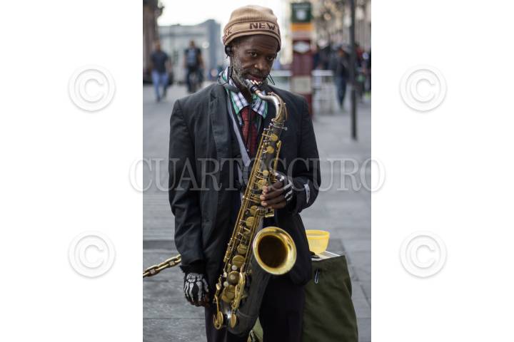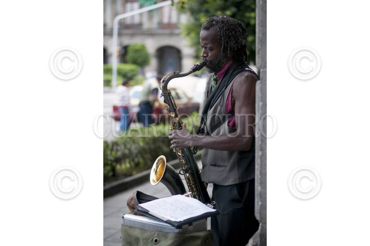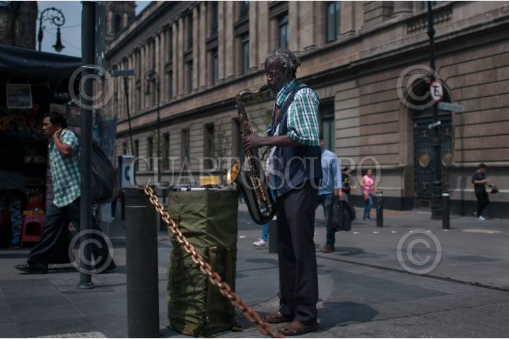 MÉXICO, D.F., 14AGOSTO2013.- Un hombre de raza negra deleita a los transeúntes que pasean sobre las calles del Centro Histórico interpretando melodías con su saxofón. FOTO: DIEGO SIMÓN SÁNCHEZ /CUARTOSCURO.COM