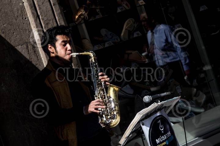 CIUDAD DE MÉXICO, 06OCTUBRE2018.- Un saxofonista toca sus notas musicales para ganarse unas monedas en el cruce de las calles República de Argentina y Luis González Obregón del centro histórico. FOTO: DIEGO SIMÓN SÁNCHEZ /CUARTOSCURO.COM