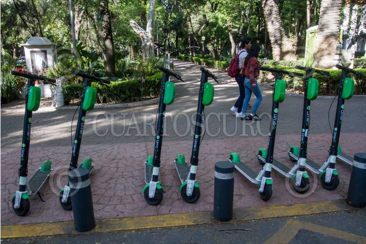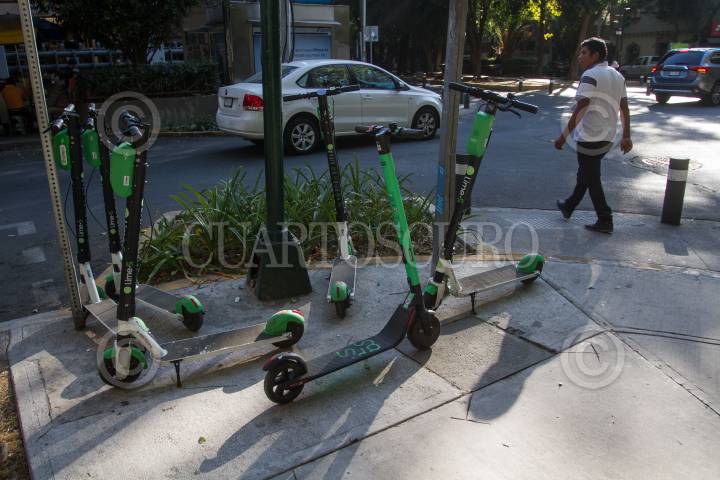 CIUDAD DE MÉXICO, 28ENERO2019.- En colonias céntricas de la Ciudad de México, como Roma y Condesa, se puede observar la proliferación de patines eléctricos rentados, lo cuales no al parecer no están regulados por autoridades capitalinas, por lo que los usuarios los dejan en cualquier lugar o cometen abusos como viajar sobre la banqueta, lo cual puede traer accidentes. FOTO: ISAAC ESQUIVEL /CUARTOSCURO.COM