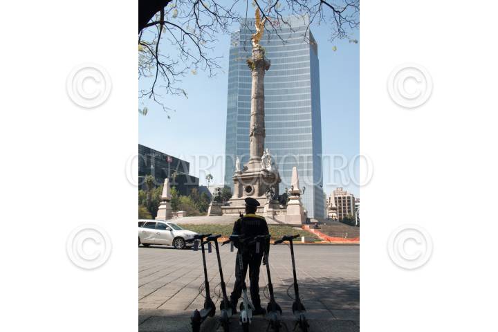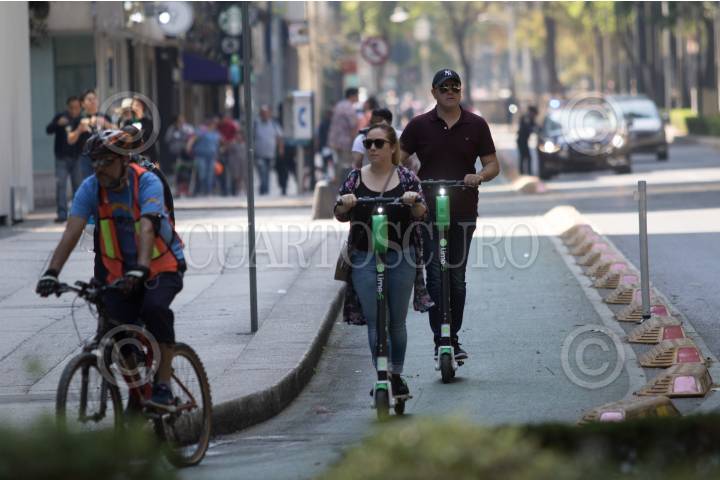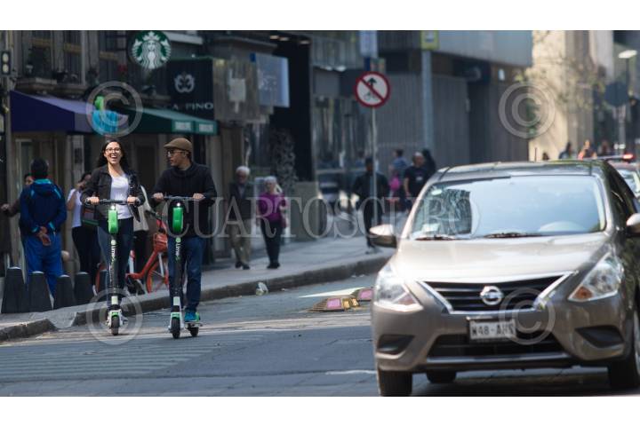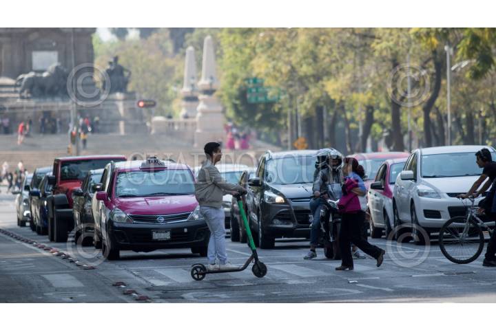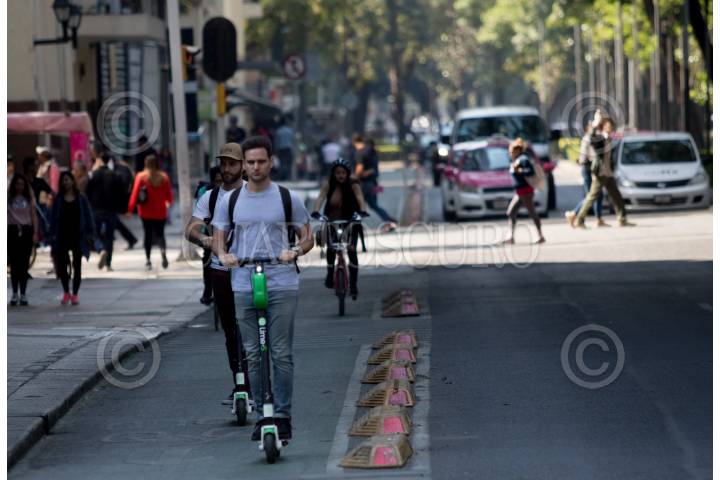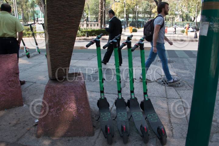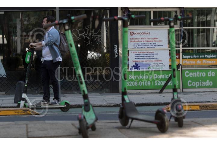 CIUDAD DE MÉXICO, 04FEBRERO2019.- Los scooters o patines del diablo eléctricos han proliferado en alcaldías como Cuauhtémoc, Miguel Hidalgo, y Benito Juárez, las unidades son un sistema de transporte individual sin anclaje fijo, por lo que los usuarios las estacionan en banquetas y pasos peatonales, apenas el pasado viernes un usuario murió atropellado por un taxista, solo una de estas empresas tiene el visto bueno de la Semovi para operar, las demás solo podrán tramitar permisos temporales, sin embargo, ninguna de las empresas ofrecen la protección básica como casco, rodilleras y coderas, que son lo recomendable en este tipo de transporte. FOTO: MOISÉS PABLO /CUARTOSCURO.COM