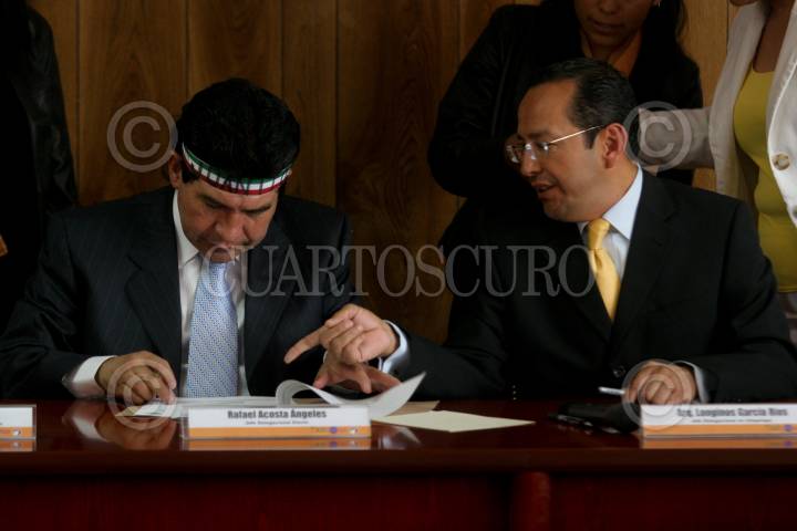 MÉXICO, D.F., 20AGOSTO2009.- El delegado electo en Iztapalapa, Rafael Acosta (JUANITO) y el delegado constitucional de Iztapalapa Longino Gracia Rios, quien le señala a "juanito" donde debe firmar el acuerdo de transición para la entrega-recepcion en la delegación Iztapalapa. FOTO: RICARDO CASTELAN/CUARTOSCURO.COM