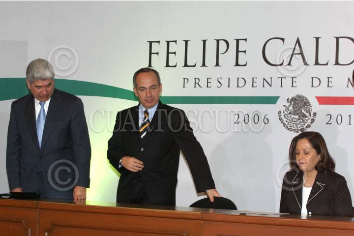 MÉXICO D.F. 28NOVIEMBRE2006.- El presidente electo Felipe Calderón Hinojosa, durante la presentación de su gabinete de politica exterior y de gobierno acompañado de Francisco Ramírez Acuña nombrado nuevo Secretaio de Gobernación y Patricia Espinosa Castellanos nueva Secretaria de Relaciones Exteriores. FOTO: GUILLERMO PEREA/CUARTOSCURO.COM